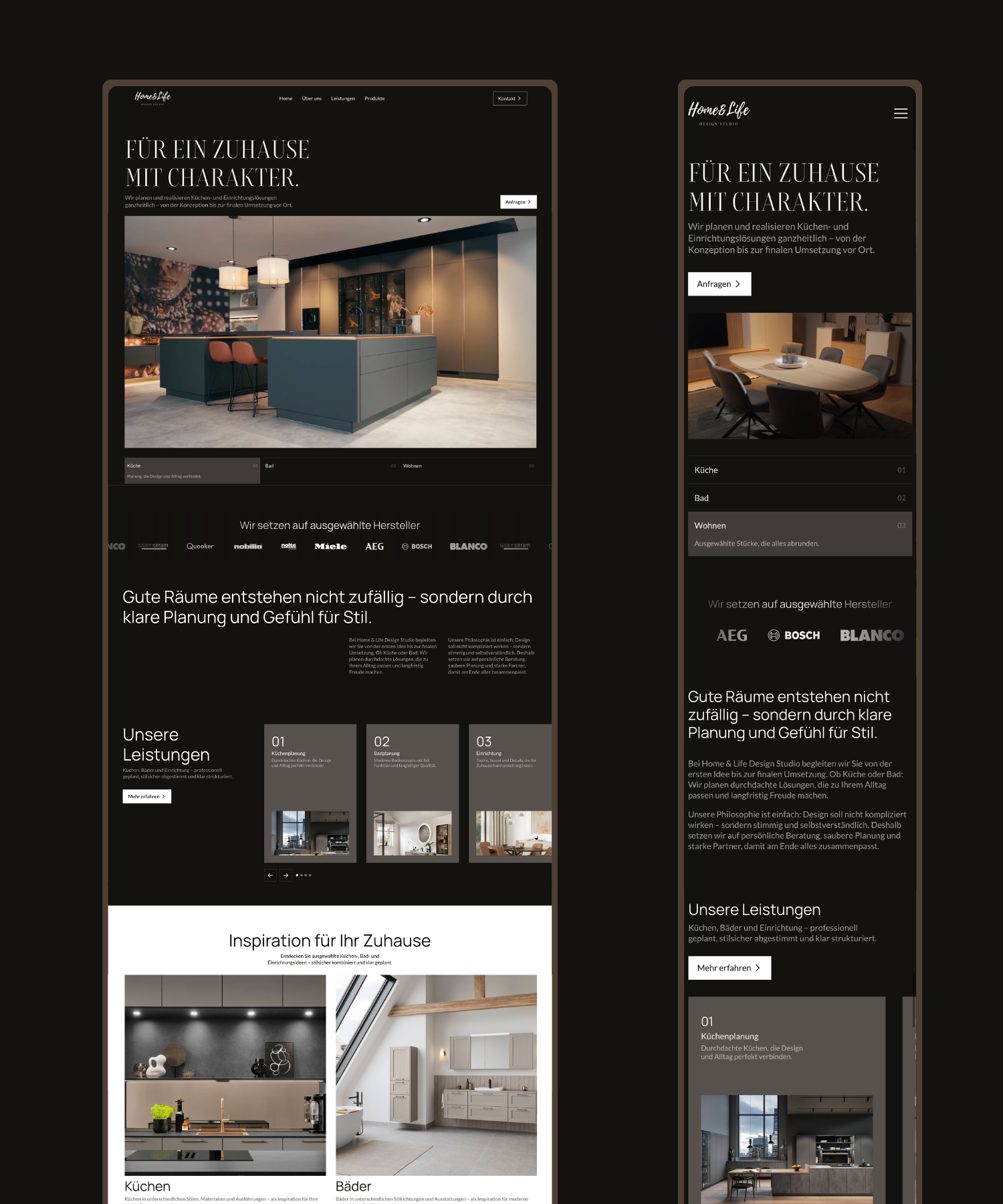 Für Home & Life Design Studio wurde eine moderne Webseite entwickelt, die das Unternehmen und seine Leistungen im Bereich Küchen, Bad und Einrichtung hochwertig präsentiert. Der Fokus lag auf einer klaren Struktur, großen Bildflächen und einer ruhigen, eleganten Gestaltung, die die Qualität der Projekte und des Showrooms widerspiegelt.